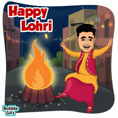 Paglalarawan ng Content: a cartoon of a man dancing in front of a fire with the words happy lohri written above him