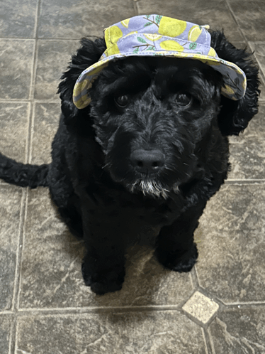 Paglalarawan ng Content: a small black dog wearing a lemon hat