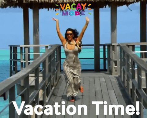 Paglalarawan ng Content: a woman is running on a pier with the words vacation time written on the bottom