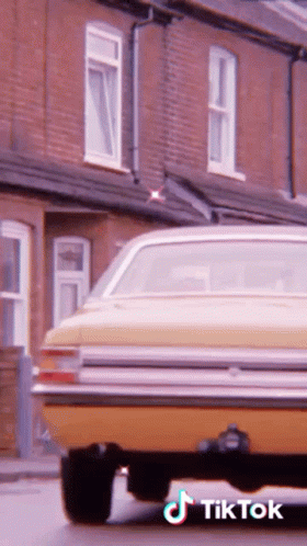 Paglalarawan ng Content: a yellow car is parked in front of a row of brick houses with tik tok written on the bottom right