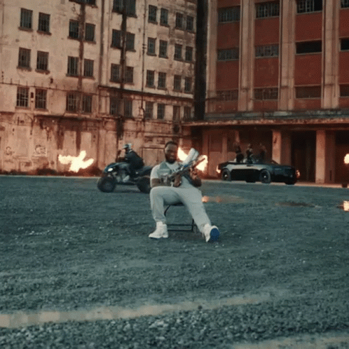 Paglalarawan ng Content: a man is sitting in a chair holding a gun in front of a building with flames coming out of it