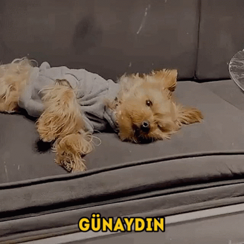 Paglalarawan ng Content: a small dog is laying on a couch with the word günaydin written on the bottom