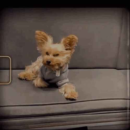 Paglalarawan ng Content: a small brown dog wearing a grey sweater is laying on a couch