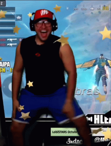 Paglalarawan ng Content: a man wearing headphones and a red hat is dancing in front of a screen with the number 341 on it