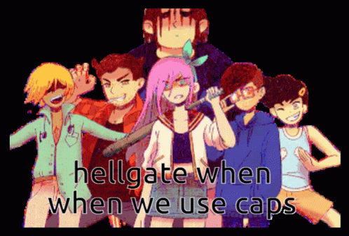 Paglalarawan ng Content: a group of anime characters standing next to each other with the words hellgate when we use caps below them