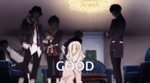 Paglalarawan ng Content: a group of anime characters are standing in a room with the word good in the corner
