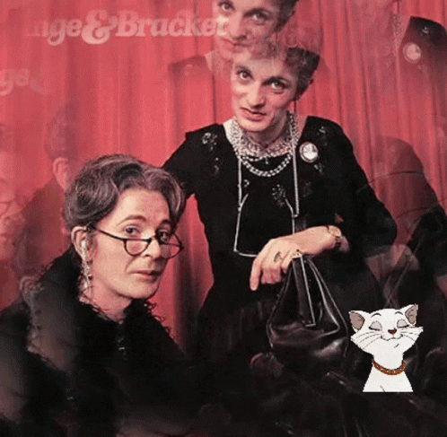 Paglalarawan ng Content: two women are standing in front of a red curtain with the words age & bracket visible