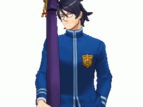 Paglalarawan ng Content: a pixel art drawing of a man in a blue jacket holding a purple pole