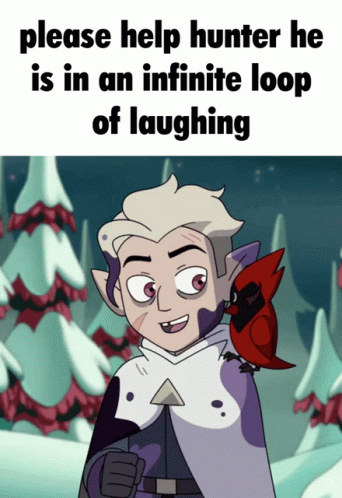 - Paglalarawan ng Content: a cartoon character with a bird on his shoulder and the words please help hunter he is in an infinite loop of laughing below him