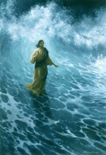 Paglalarawan ng Content: a painting of jesus walking through the ocean