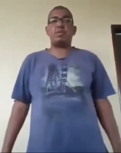 Paglalarawan ng Content: a man wearing glasses and a blue t-shirt is standing in front of a door .