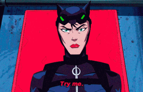 Paglalarawan ng Content: a cartoon of catwoman is laying on a red surface and says try me