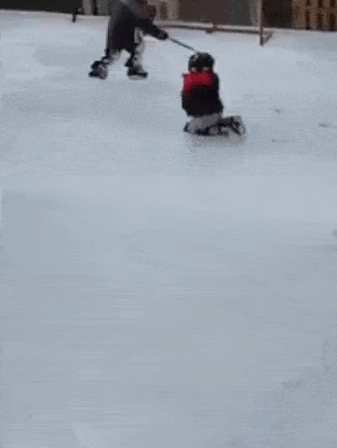 Paglalarawan ng Content: a boy and a dog are playing hockey in the snow . the dog is pulling the boy on a leash .