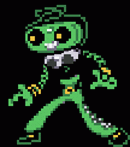 Paglalarawan ng Content: a pixel art of a green monster walking on a black background