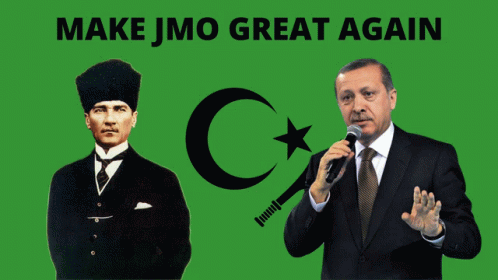 Paglalarawan ng Content: a green background with two men and the words make jmo great again on top