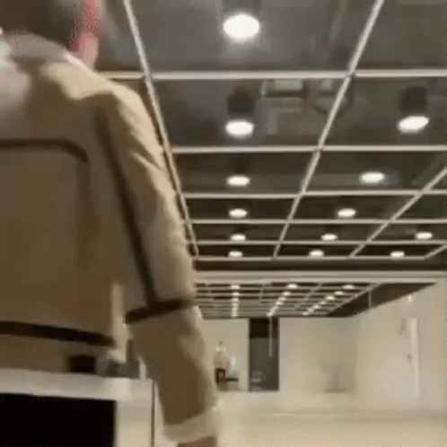 Paglalarawan ng Content: a man in a brown jacket is walking through a room with a ceiling that has squares on it .