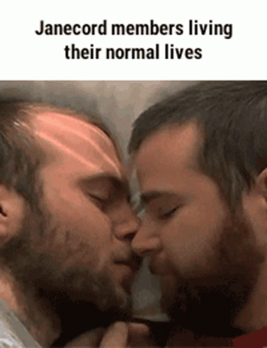 Paglalarawan ng Content: two men kissing with the words janecord members living their normal lives