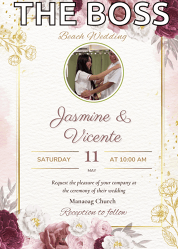 Paglalarawan ng Content: a wedding invitation for jasmine and vicente on saturday may 11