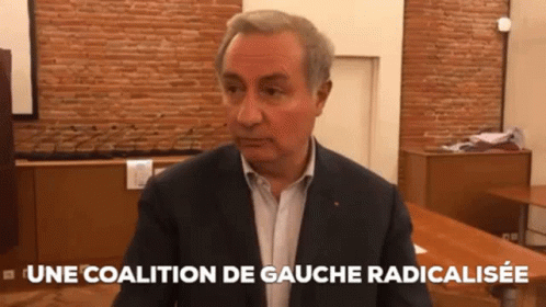Paglalarawan ng Content: a man sitting at a table with the words une coalition de gauche radicalisee above him