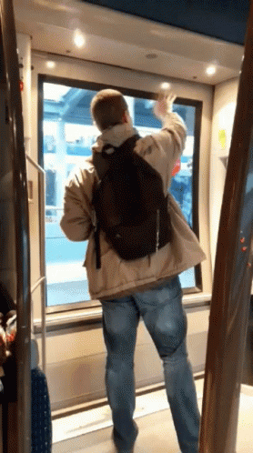 Paglalarawan ng Content: a man with a backpack is looking out a window on a train