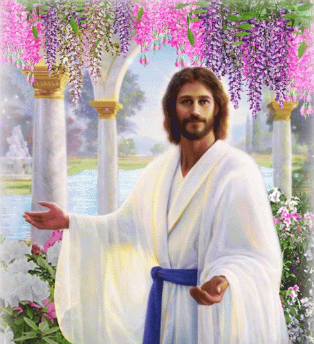 Paglalarawan ng Content: a painting of jesus in a white robe with purple flowers behind him