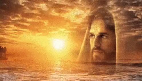 Paglalarawan ng Content: a painting of jesus ' face in the water with the sun behind him .