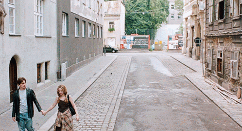 Paglalarawan ng Content: a man and woman are walking down a cobblestone street