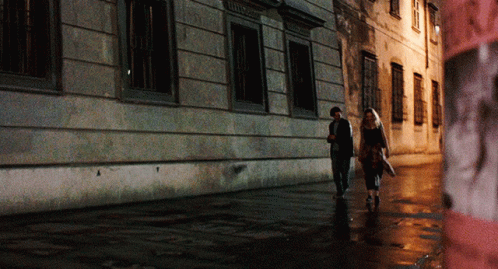 Paglalarawan ng Content: two people are walking down a wet sidewalk in front of a building that says " a "