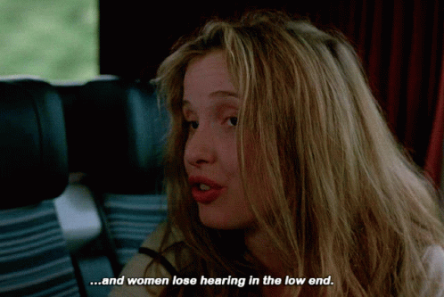 Paglalarawan ng Content: a woman says " and women lose hearing in the low end " in a movie