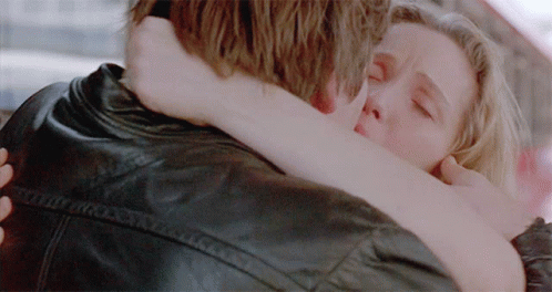 Paglalarawan ng Content: a man in a leather jacket is hugging a woman in a white shirt