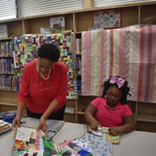 Paglalarawan ng Content: a woman and a girl are sitting at a table making a quilt .