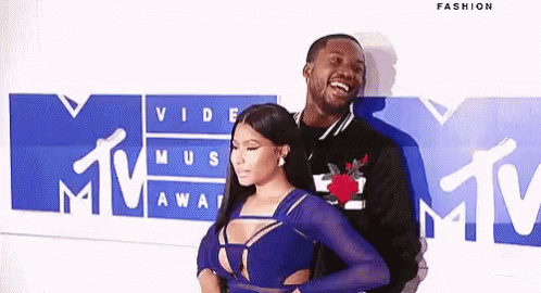Paglalarawan ng Content: a man and a woman are standing next to each other in front of a mtv logo on a blue carpet .