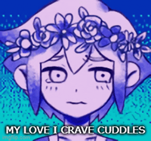 Paglalarawan ng Content: a girl with a flower crown on her head says " my love i craves cuddles "