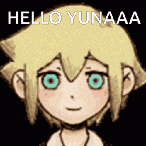 Paglalarawan ng Content: a cartoon character with yellow hair and blue eyes says hello yunaaa