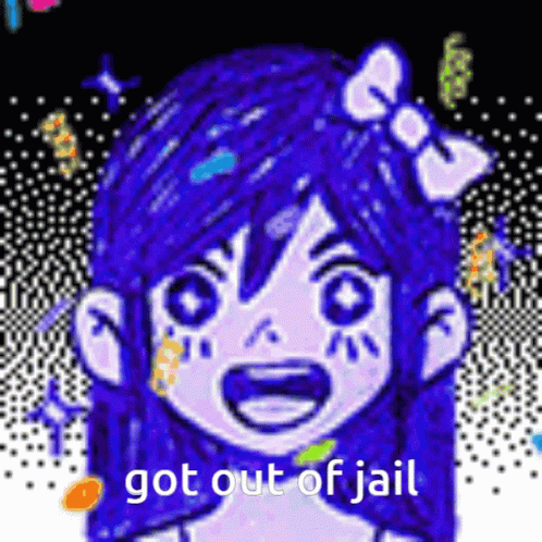 Paglalarawan ng Content: a cartoon girl with blue hair and a bow on her head is laughing and says `` got out of jail '' .
