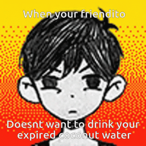 Paglalarawan ng Content: a pixel art of a boy with the caption when your friendito doesn t want to drink your expired coconut water