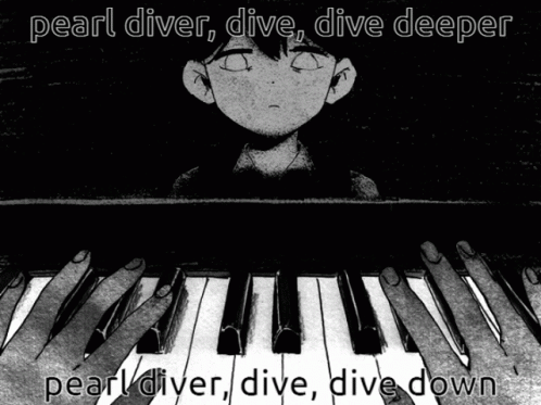 Paglalarawan ng Content: a black and white drawing of a boy playing a piano with the words pearl diver dive dive deeper