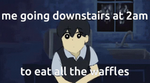 - Paglalarawan ng Content: a cartoon of a person holding a knife with the words " me going downstairs at 2 am to eat all the waffles "
