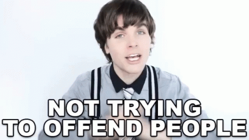 - Paglalarawan ng Content: a young man wearing suspenders and a tie is standing in front of a white background and saying not trying to offend people .