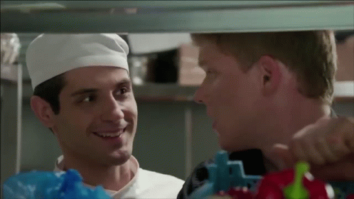 Paglalarawan ng Content: a man in a chef 's hat is smiling at another man in a kitchen