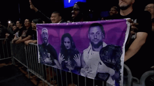 Paglalarawan ng Content: a group of people holding a purple banner with a picture of a man and woman on it