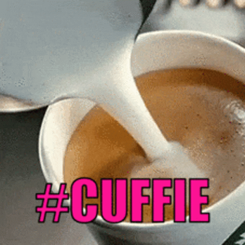 Paglalarawan ng Content: someone is pouring milk into a cup of coffee with the hashtag #cuffie on the bottom