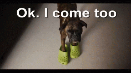 Paglalarawan ng Content: a dog wearing a pair of green crocs with the words ok i come too above it
