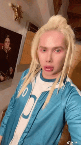 Paglalarawan ng Content: a woman with blonde hair is wearing a blue jacket and a white shirt with the letter o on it