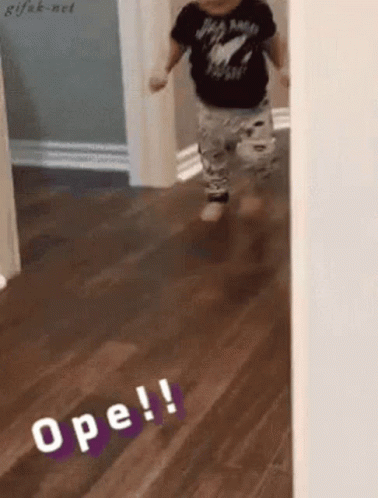 Paglalarawan ng Content: a baby is walking on a wooden floor and the word ope is on the floor