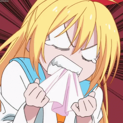 Paglalarawan ng Content: a blonde anime girl blowing her nose with a pink napkin