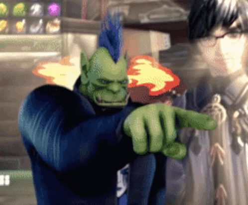 Paglalarawan ng Content: an orc with a blue mohawk pointing at someone