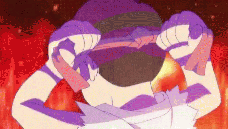 Paglalarawan ng Content: a purple and white cartoon character is holding a red object in front of his face .