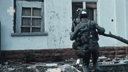 Paglalarawan ng Content: a group of soldiers are walking in front of a house .