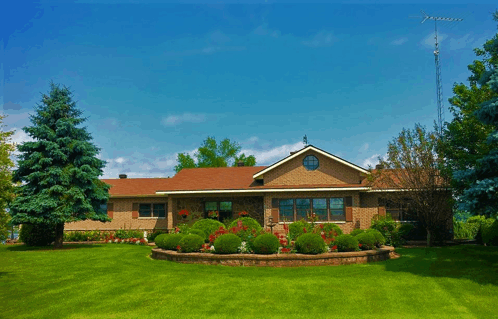 Paglalarawan ng Content: a brick house with a red roof has a round window on the front of it